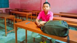 ক্লাস করার জন্য একা বসে আছেন পঞ্চম শ্রেণির শিক্ষার্থী তামিম মিয়া।
