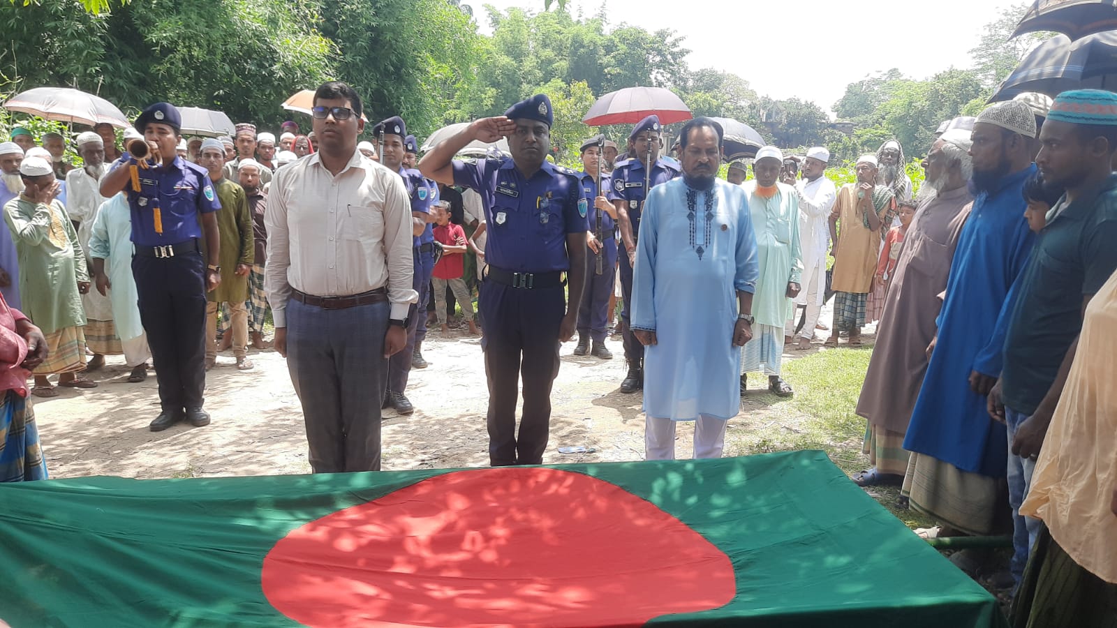তাহার নিজ বাড়ীর সামনে মঙ্গলবার সকাল ১১টায় রাষ্ট্রিয় মর্যাদা প্রদান করা হয়।