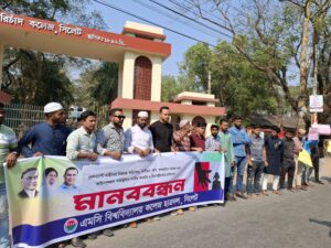 এমসি কলেজ ছাত্রদলের আহবায়ক সেলিম আহমদ সাগরের সভাপতিত্বে এবং সদস্য সচিব মুহাইমিনুল হক তপুর সঞ্চালনায় মানববন্ধন কর্মসূচিতে বক্তব্য রাখেন কলেজ ছাত্রদলের যুগ্ম আহবায়ক খান মোহাম্মদ সামি(আজহারুল ইসলাম), যুগ্ম আহবায়ক রাজিব হোসাইন, সদস্য জাকির চৌধুরী।