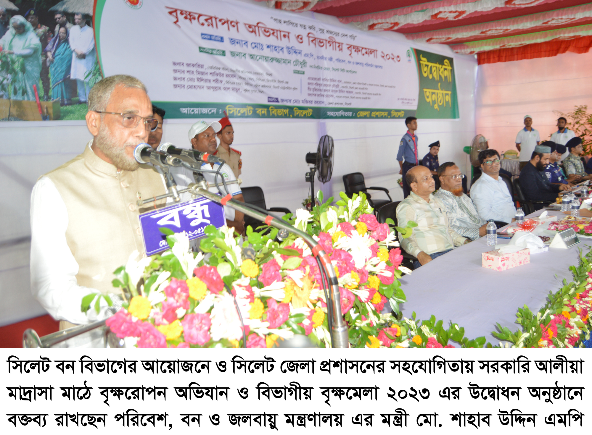 তিনি বৃহস্পতিবার (১৩ জুলাই) সিলেট বন বিভাগের আয়োজনে ও সিলেট জেলা প্রশাসনের সহযোগিতায় সরকারি আলীয়া মাদ্রাসা মাঠে বৃক্ষরোপন অভিযান ও বিভাগীয় বৃক্ষমেলা ২০২৩ এর উদ্বোধনী অনুষ্ঠানে প্রধান অতিথির বক্তব্যে উপরোক্ত কথাগুলো বলেন। এবারের প্রতিপাদ্য বিষয় ছিল “গাছ লাগিয়ে যত্ন করি, সুস্থ প্রজন্মের দেশ গড়ি”।