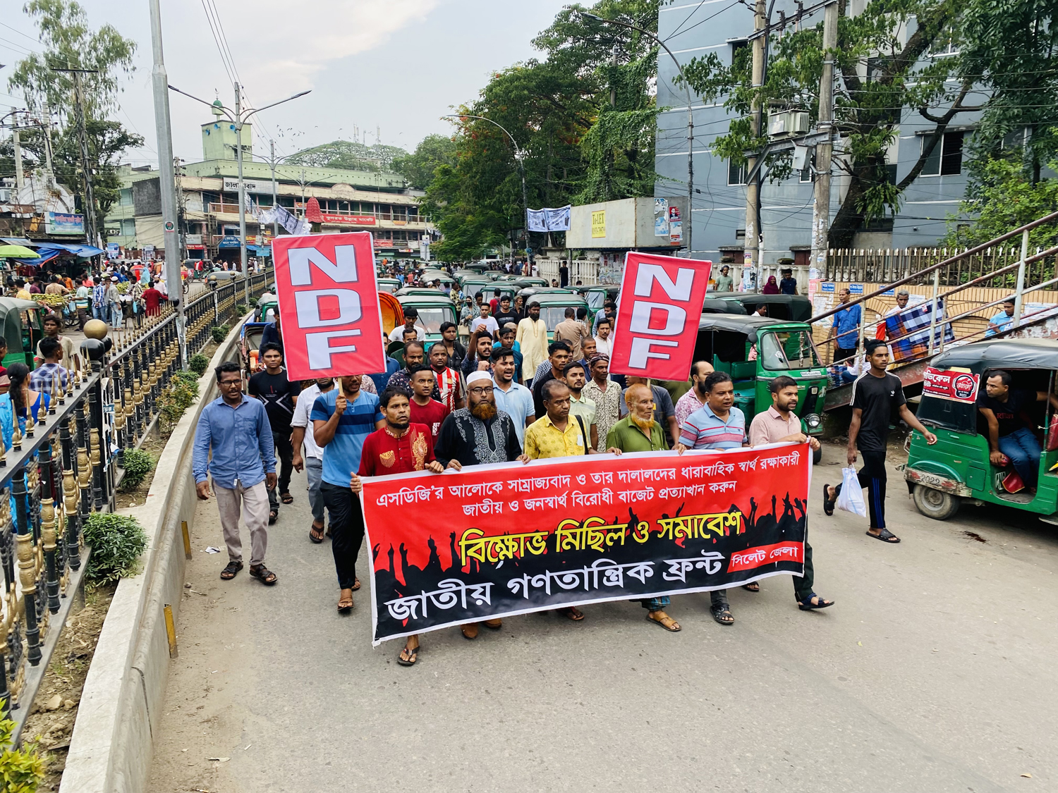 বাজেটকে ‘গণবিরোধী’ আখ্যা দিয়ে নগরীতে বিক্ষোভ মিছিল ও সমাবেশ করে জাতীয় গণতান্ত্রিক ফ্রন্ট সিলেট জেলা শাখা। বিকেল ৫টায় সুরমা পয়েন্টে জমায়েত হয়ে মিছিল শুরু হয়ে শহরের বিভিন্ন গুরুত্বপূর্ণ সড়ক প্রদক্ষিণ করে কোর্ট পয়েন্টে এসে সমাবেশে মিলিত হয়। জেলা কমিটির সহ-সভাপতি সুরুজ আলীর সভাপতিত্বে এবং দপ্তর সম্পাদক রমজান আলী পটুর পরিচালনায় বক্তব্য রাখেন, জাতীয় গণতান্ত্রিক ফ্রন্ট (এনডিএফ) সিলেট জেলা কমিটির সহ-সভাপতি অধ্যাপক আবুল ফজল, সাধারণ সম্পাদক শাহীন আলম, শাহপরান থানা কমিটির সাধারণ সম্পাদক নাজমুল হোসেন, বাংলাদেশ ট্রেড ইউনিয়ন সংঘ সিলেট জেলা কমিটির অর্থ সম্পাদক আব্দুস সালাম, সিলেট জেলা হোটেল শ্রমিক ইউনিয়ন এর সাধারণ সম্পাদক আনছার আলী, জাতীয় ছাত্রদল এমসি কলেজ শাখা নেতা বদরুল আজাদ, জেলা কমিটির অন্যতম সদস্য শুভ আজাদ (শান্ত), বাংলাদেশ কৃষক সংগ্রাম সমিতি সিলেট সদর উপজেলা কমিটির অন্যতম নেতা আলী আহমদ সহ-প্রমুখ।