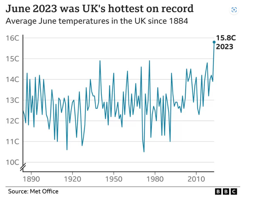 এই মানবসৃষ্ট জলবায়ুর পরিবর্তনের কারণে শুধু ইউকে ক্ষতিগ্রস্ত হচ্ছে না, পৃথিবীর ৭২ টা দেশে গত জুনে সর্বোচ্চ তাপমাত্রা পরিলক্ষিত হয় ;যেটা ১৮৮৪ সালে রেকর্ড লিপিবদ্ধ করার পর থেকে সর্বোচ্চ বলে রিপোর্টে উল্লেখ করা হয়। এই তাপমাত্রা সর্বোচ্চ, সর্বনিম্ন ও গড় তাপমাত্রাতে ও সব রেকর্ড ছাড়িয়ে যাচ্ছে বলে ব্রিটেনের আবহাওয়া অফিসের মুখপাত্র মার্ক জানিয়েছেন।