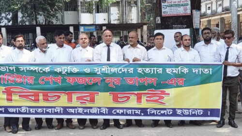 বিচার বিভাগ সম্পর্কে ঢাকা দক্ষিণ সিটি কর্পোরেশনের মেয়র ব্যারিস্টার ফজলে নূর তাপসের কটুক্তি ও সুশীল সমাজের প্রতিনিধিদের হত্যার হুমকির প্রতিবাদে বাংলাদেশ জাতীয়তাবাদী আইনজীবী ফোরাম সিলেট ইউনিট মানববন্ধন ও প্রতিবাদ সভা…